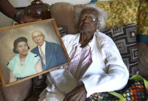 Above: America’s Oldest citizen Jeralean Talley with a photograph showing her and her late husband Alfred, on her 115th birthday...